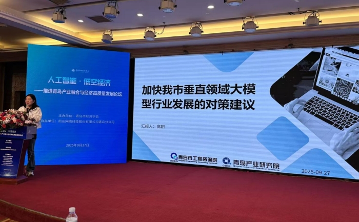 近日,由青岛市经济学会主办的“人工智能与低空经济—推进青岛产业融合与经济高质量发展论坛”在中国海洋大学学术交流中心会议厅顺利举行。我院作为区域产业发展智库代表受邀参会,院产业研究首席代表、产业规划咨询部副主任高阳围绕 “垂直领域大模型赛道发展” 作主题发言,以专业研究成果为青岛产业升级建言献策。