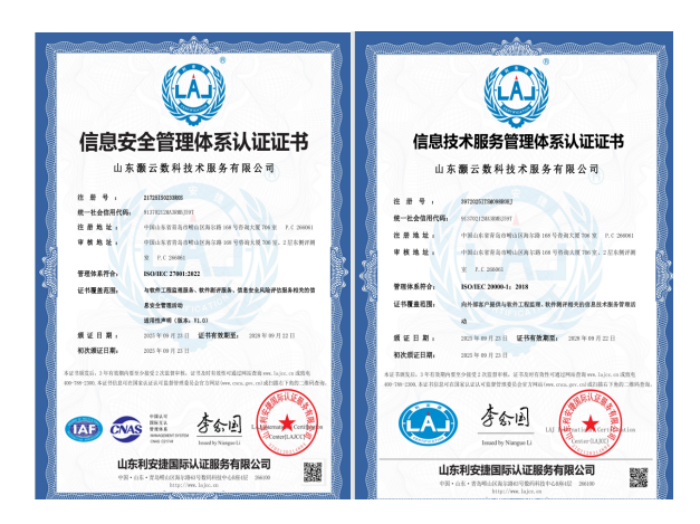 近日,经过多方支持和团队共同努力,山东灏云数科技术服务有限公司获得了ISO/IEC 20000 信息技术服务管理体系认证证书和ISO/IEC 27001 信息安全管理体系认证证书。证书覆盖范围包含了与软件工程监理服务、软件测评服务、信息安全风险评估服务相关的管理活动。