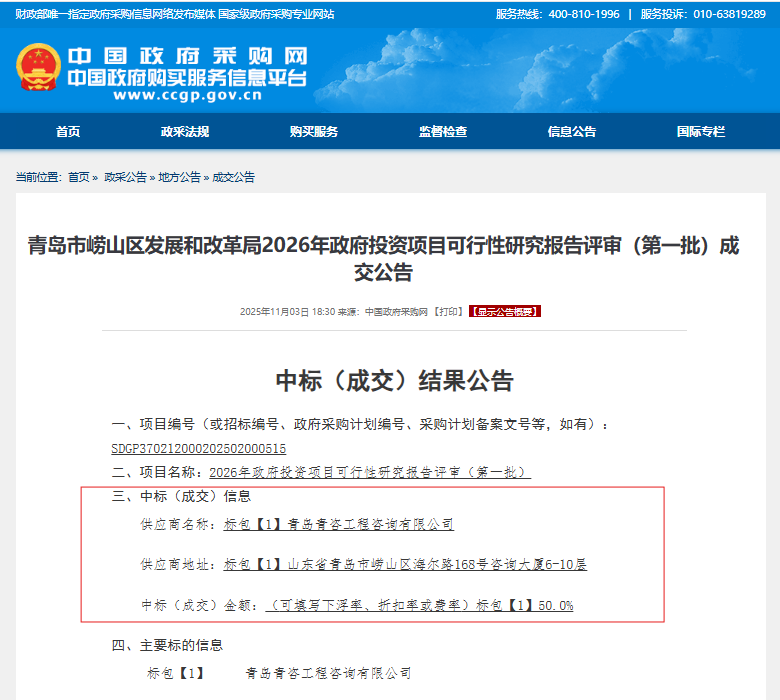 本次中标的评审项目覆盖崂山区2026年计划实施的第一批政府投资项目。青咨公司将组建以资深专家为核心的评审团队,严格依据国家及地方相关法规政策,对项目建设的必要性、技术方案的可行性、财务经济的合理性、社会影响的稳定性以及生态环境的可持续性等进行全方位、多角度的专业评估,旨在为崂山区发展和改革局的最终决策提供客观、公正、精准的咨询意见,从源头上提升政府投资效益,防范投资风险,确保每一分财政资金都用在“刀刃上”。(完)