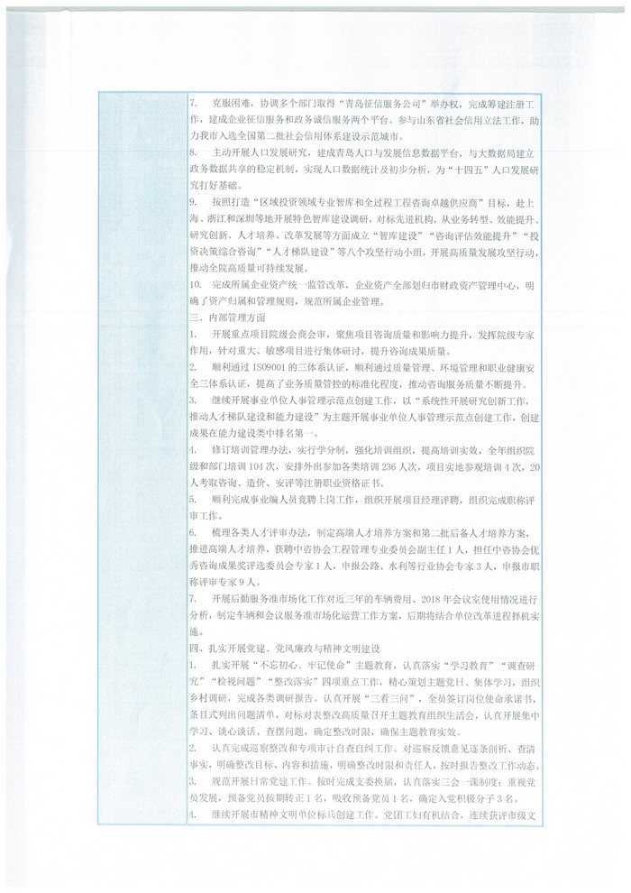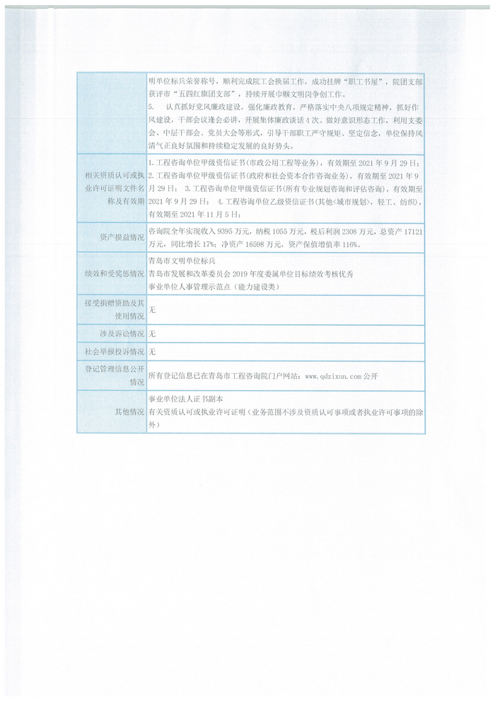2019年,青岛市工程咨询院咨询院全年实现收入9395万元,纳税1055万元,税后利润2308万元,总资产17121万元,同比增长17%;净资产16598万元,资产保值增值率116%。