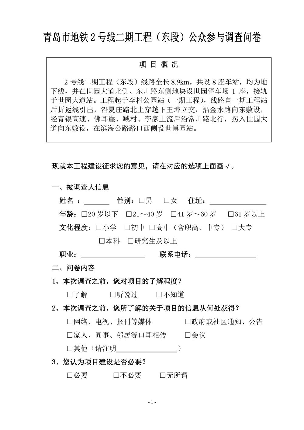 附件:青岛市地铁2号线二期工程(东段)公众参与调查问卷