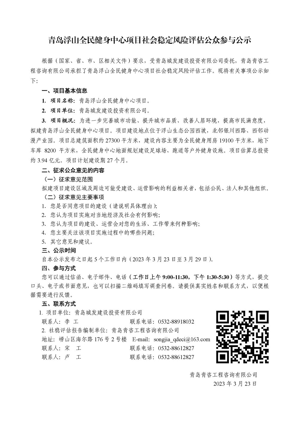 青岛浮山全民健身中心项目社会稳定风险评估公众参与公示