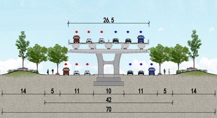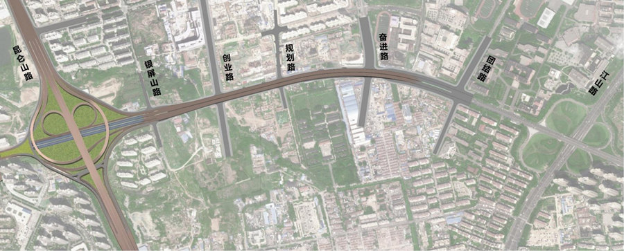 总体方案:主线西起昆仑山路,与G228丹东线(嘉陵江路西延段)改线工程昆仑山路立交相接,向东新建双向六车道高架桥分别上跨银屏山路、创业路、奋进路后接地,结合主线接地点设1对进出口,服务区域到发交通,继续向东以地面道路接入嘉陵江路-江山路立交;桥下或主线引桥两侧设双向4~6车道辅路,服务沿线地块集散交通需求,渠化辅路沿线相交路口,提升地面通行能力。主要建设内容包括道路工程、桥梁结构、管线工程、交通设施、景观工程、照明工程及相关附属工程。项目总占地13.2837公顷,其中:已批用地6.8485公顷,其他6.4352公顷。