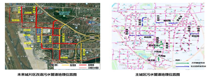 对未来城片区中川路(兴阳路-虹桥路)、凤岗路(兴阳路-虹桥路)、新郑路(天河路-民航路)、浦东路(两江路-黑龙江北路)、长城南路(迎宾路-黑龙江北路)、重庆北路(迎宾路-宝安路)、天河路(凤岗路-长城南路)、两江路(浦东路-长城南路)、宝安路(新郑路-重庆北路)、民航路(新郑路-长城南路)以及主城区顺城路(正阳路-明阳路)、德阳路(靖城路-长城路)、崇阳路(康城路-长城路、民城路-宁城路)、阜城支路(长城路-春城路)、兴阳支路(兴阳路-长城一支路)、建文支路(建文路-礼阳路)等道路的雨污水管道进行清淤修复,管径为DN300-DN1000,总长度约20000m。