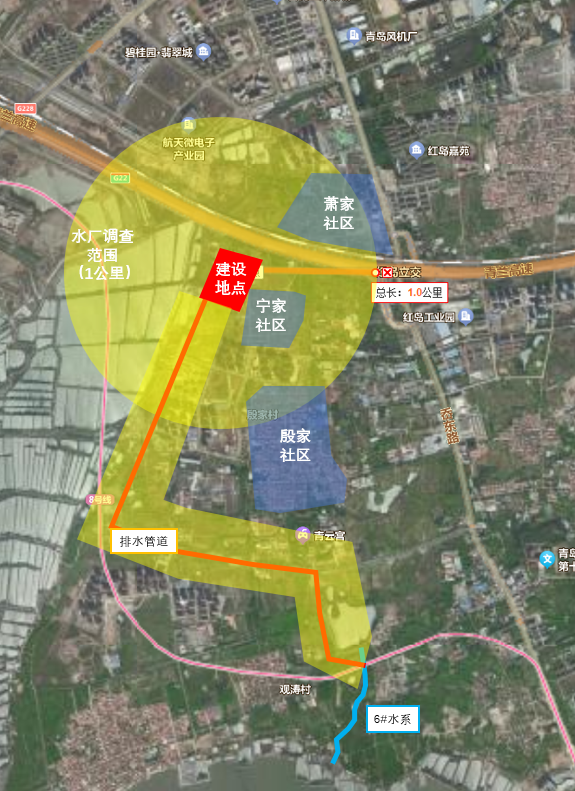 项目建设全地下水质净化厂一座,设计出水水质达到地表水准Ⅳ类标准。主要建设内容包括建设地下箱体、综合楼、臭氧发生间、科普馆、疏散楼梯等建(构)筑物,总建筑面积约为48000m2;购置安装相关配套设备,规模3万m3/d;建设地面景观、厂区管线等工程;建设DN1000尾水排放管道,长度约4.4km。管线路由布置为:沿环岛西路东侧规划绿化带向南敷设至经二路路口,标准段尾水管道中心线距离道路中心线13.5~23.4m——沿经二路南侧现状绿化带向东敷设至经一路五支路路口,标准段尾水管道中心线距离道路中心线35m——沿经一路五支路西侧规划绿化带向南敷设至经一路路口,标准段尾水管道中心线距离道路中心线19m——沿经一路南侧规划绿化带向东敷设至红岛规划6#水系西侧,标准段尾水管道中心线距离道路中心线25.7m,尾水排入规划6#水系之前设置1座消能井。